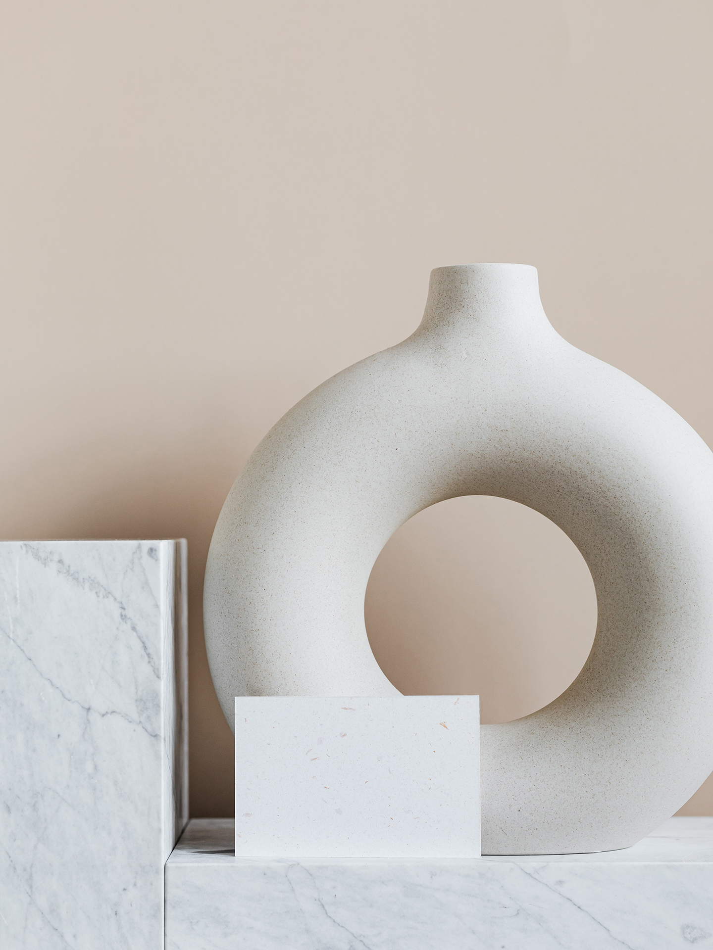 The "Emily" is a ceramic vase in natural white color, shaped like a doughnut. It's unique shape adds a playful touch to any floral arrangement.